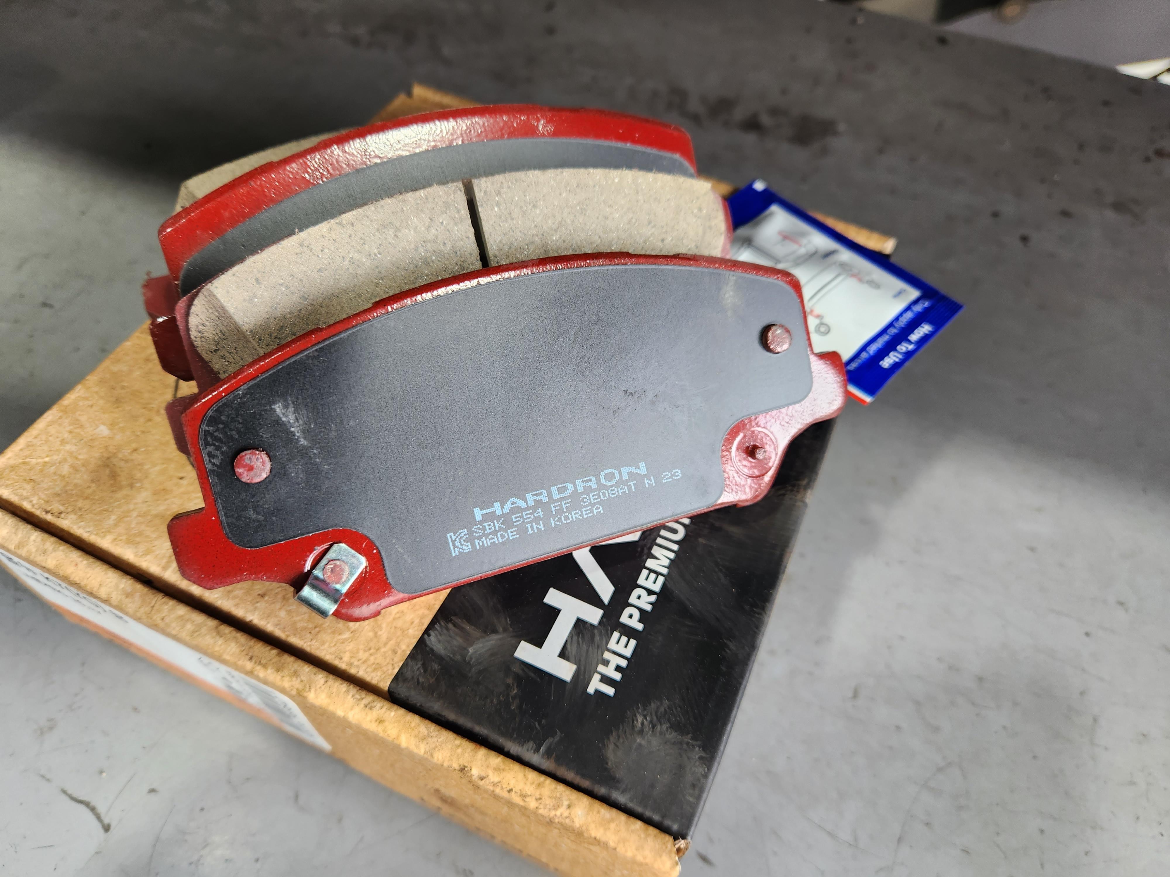 전륜측 브레이크 패드도 마모가 많이 되어서 함께 교환을 합니다. 상신브레이크 하드론으로 작업을 하였습니다. 그랜져 IG는 브레이크 패드 마모가 조금 빠른 편인 것 같아요.