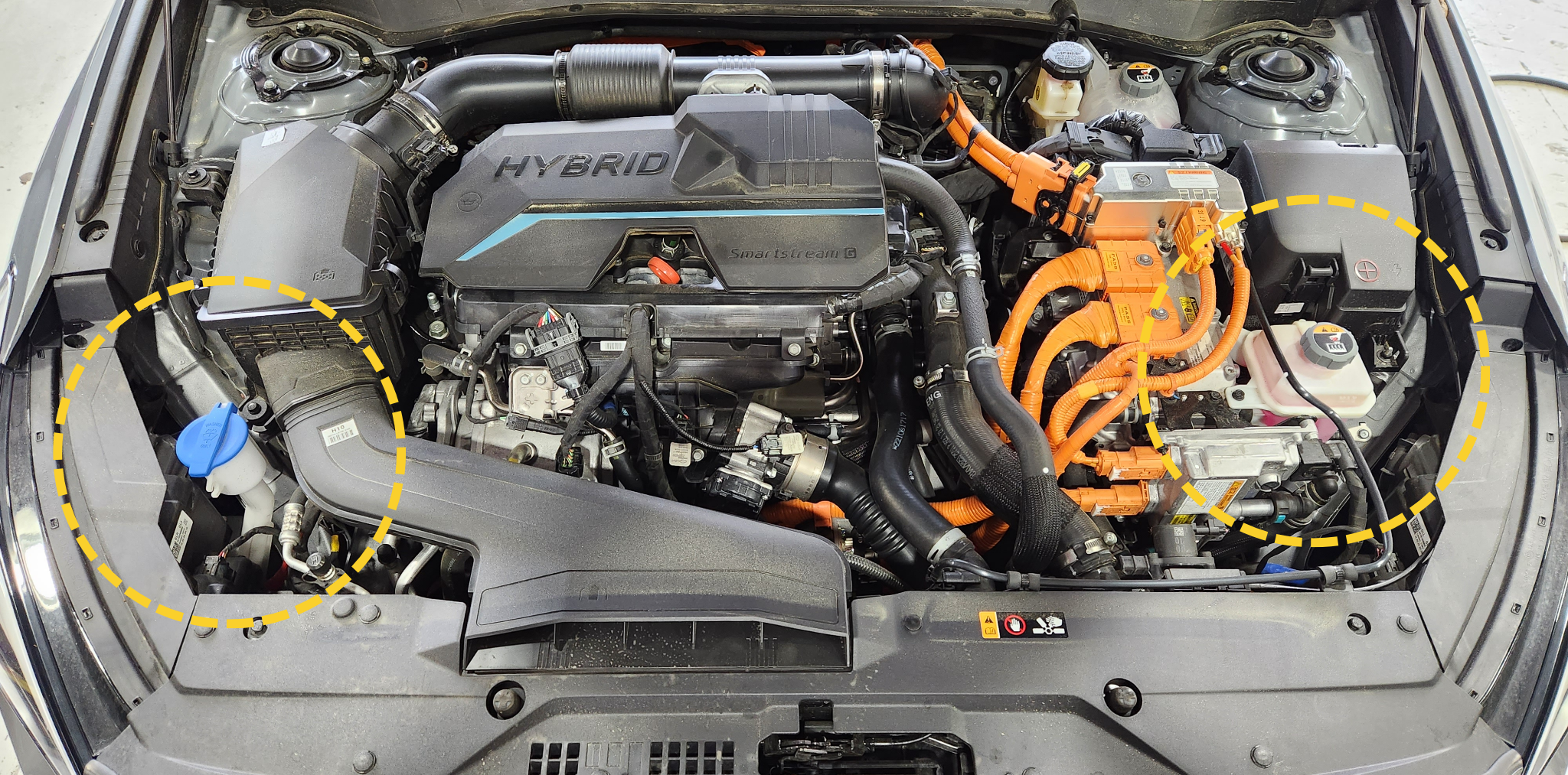 보닛을 열면 조수석 쪽에 파란 뚜껑이 워셔액, 운전석 쪽에 표시된 부분이 냉각수 탱크입니다.