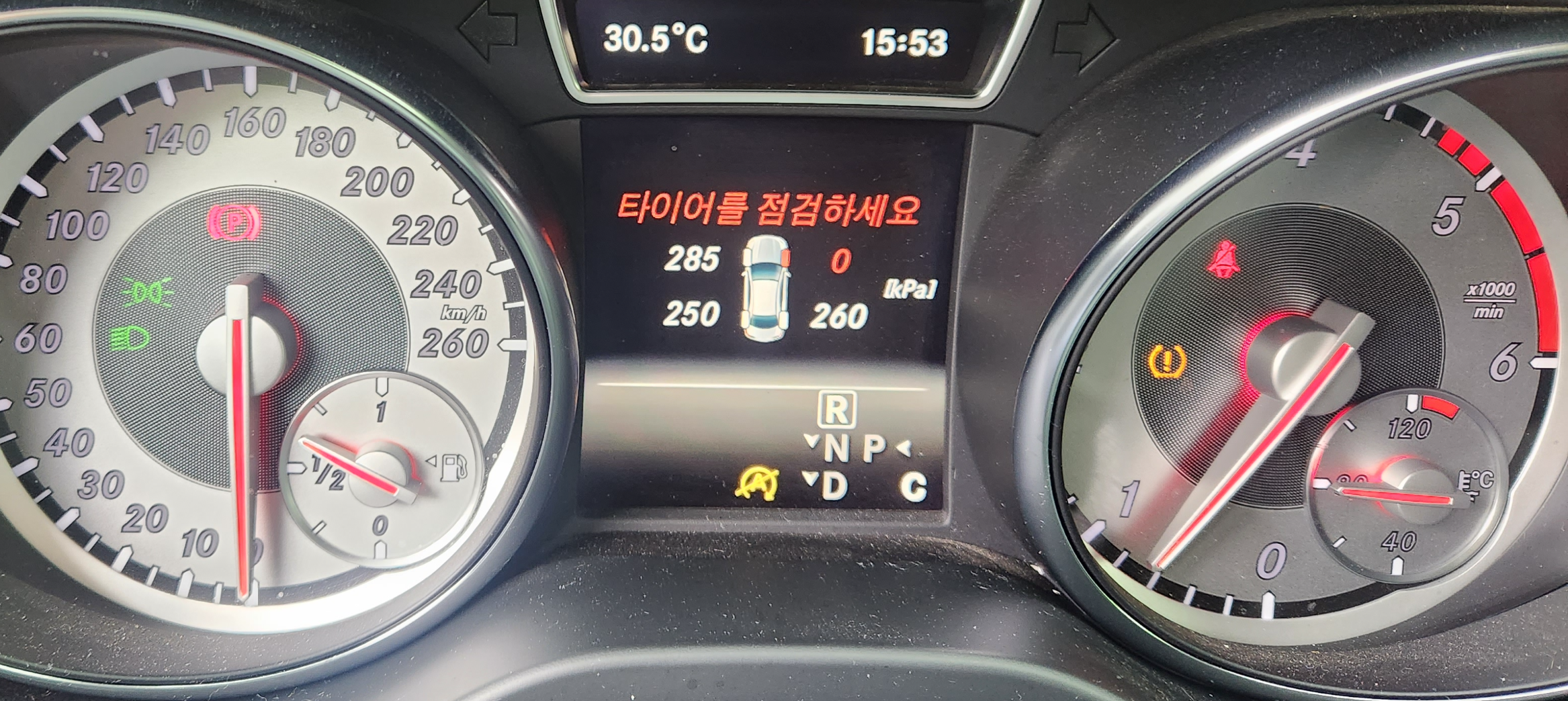 위 사진을 보시면 계기판에 전면 우측 타이어 압력이 0으로 나오는 것을 확인할 수 있습니다. 오른쪽 ( ! ) 모양이 타이어 경고등입니다. 펑크가 나거나 날씨가 추워져서 압력이 떨어지면 저 노란색 경고등이 들어오게 됩니다. 펑크를 수리하거나 압력을 다시 세팅하면 경고등이 소등되는데요. 이번에는 타이어가 터진 거라 교환을 해야 해결이 되겠지요.