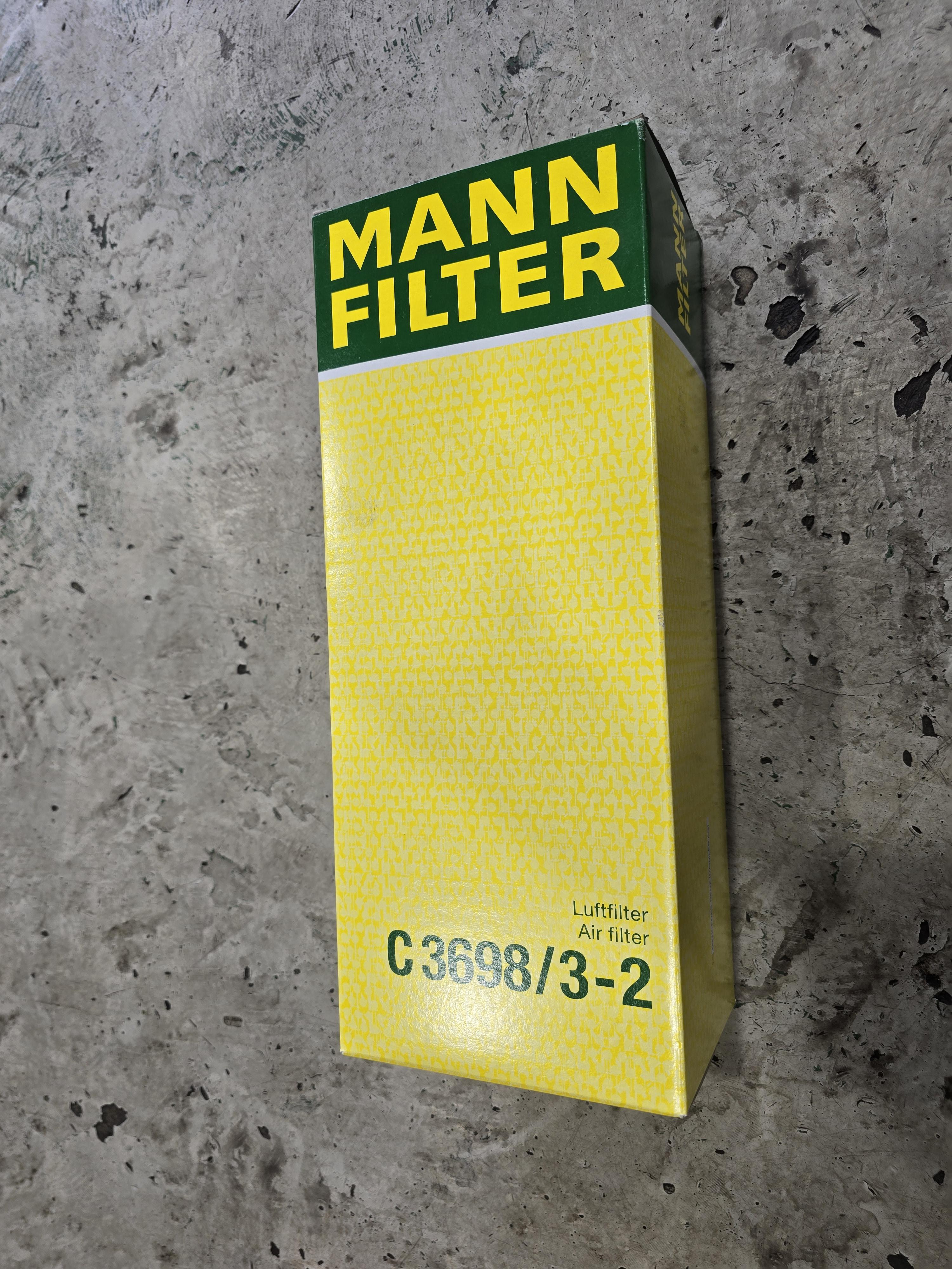 에어클리너 mann 상자 안에 두 개의 에어클리너가 들어 있습니다.
