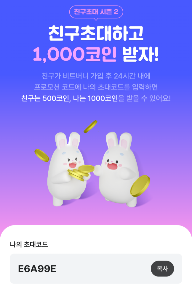 버니비트에 가입할 때 위 코드를 입력하면 500 코인을 받을 수 있습니다.