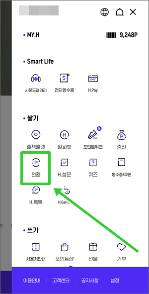 - 그리고 아래에 있는 블루멤버스 포인트를 눌러서 블루멤버스 포인트 →H포인트로 전환을 해 주시면 되겠습니다.