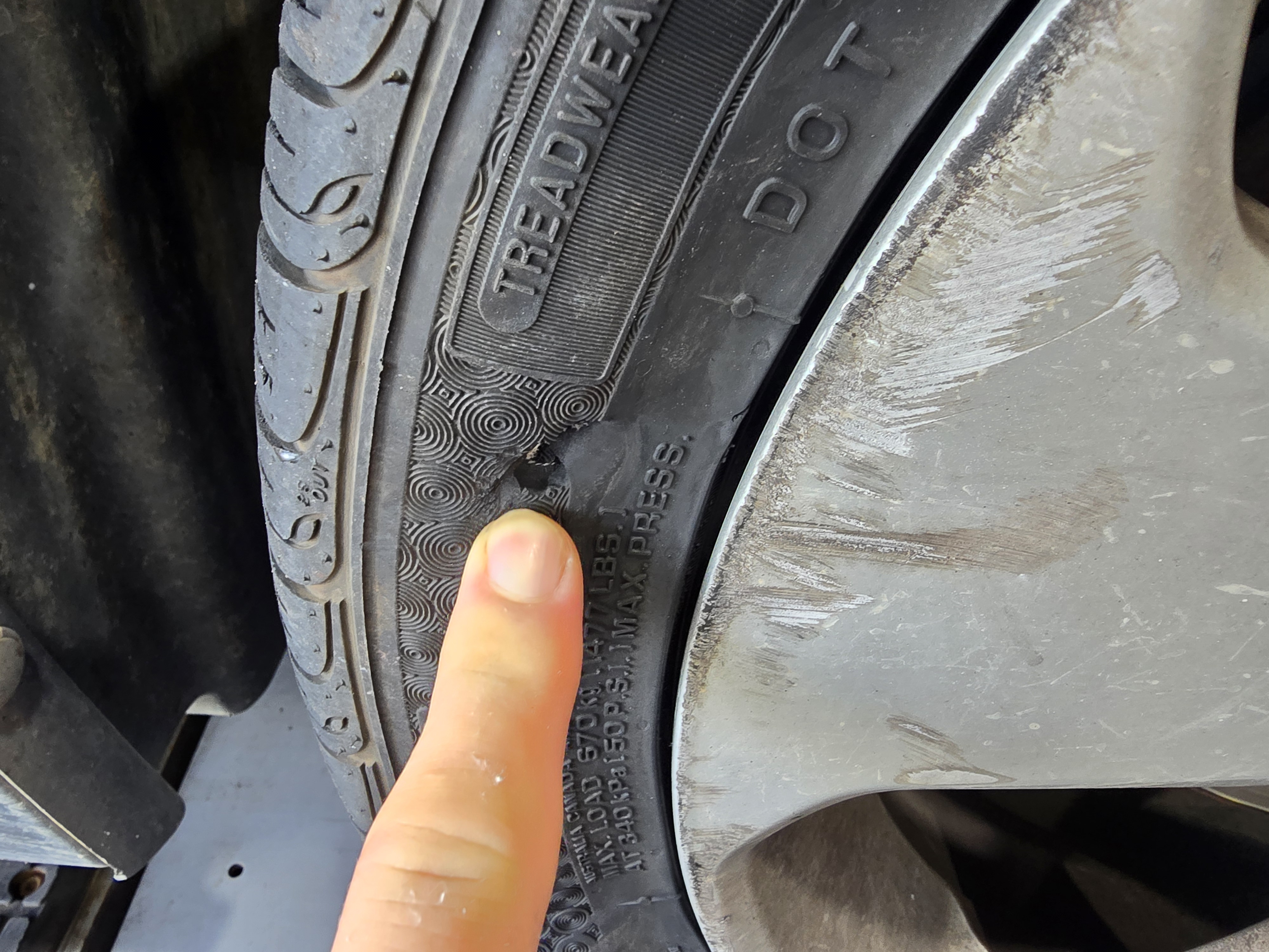 타이어 옆면이 찢어진 모습인데요.