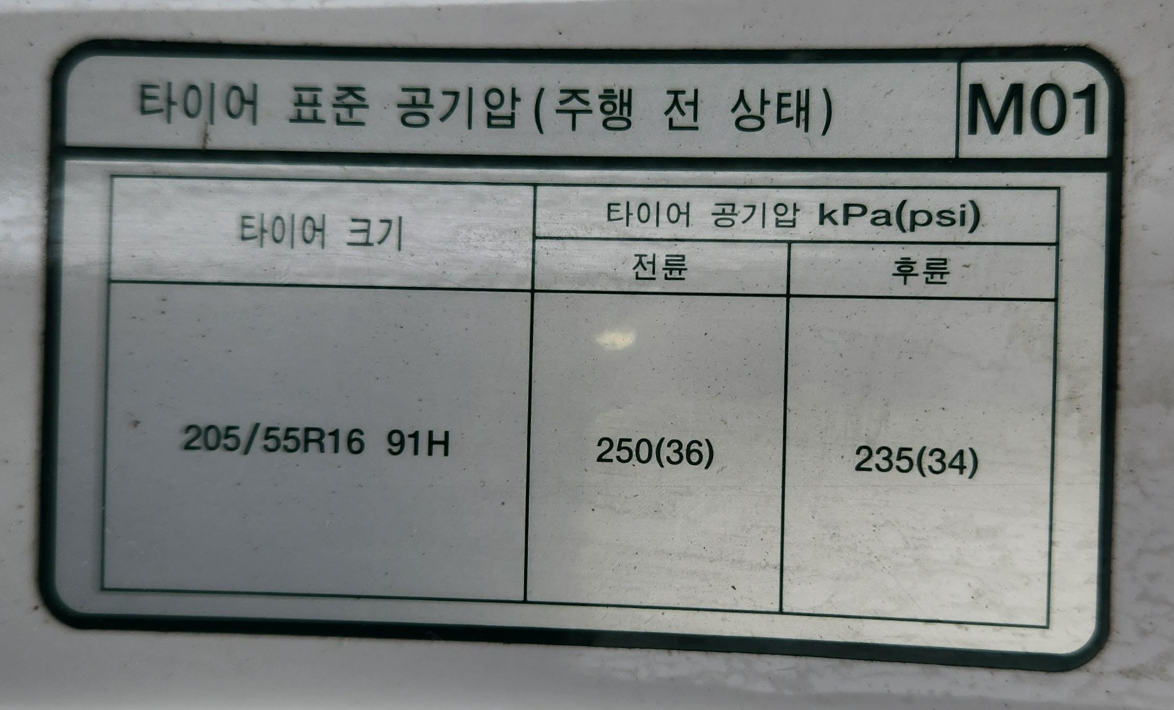 표준 공기압 (주행 전 상태)